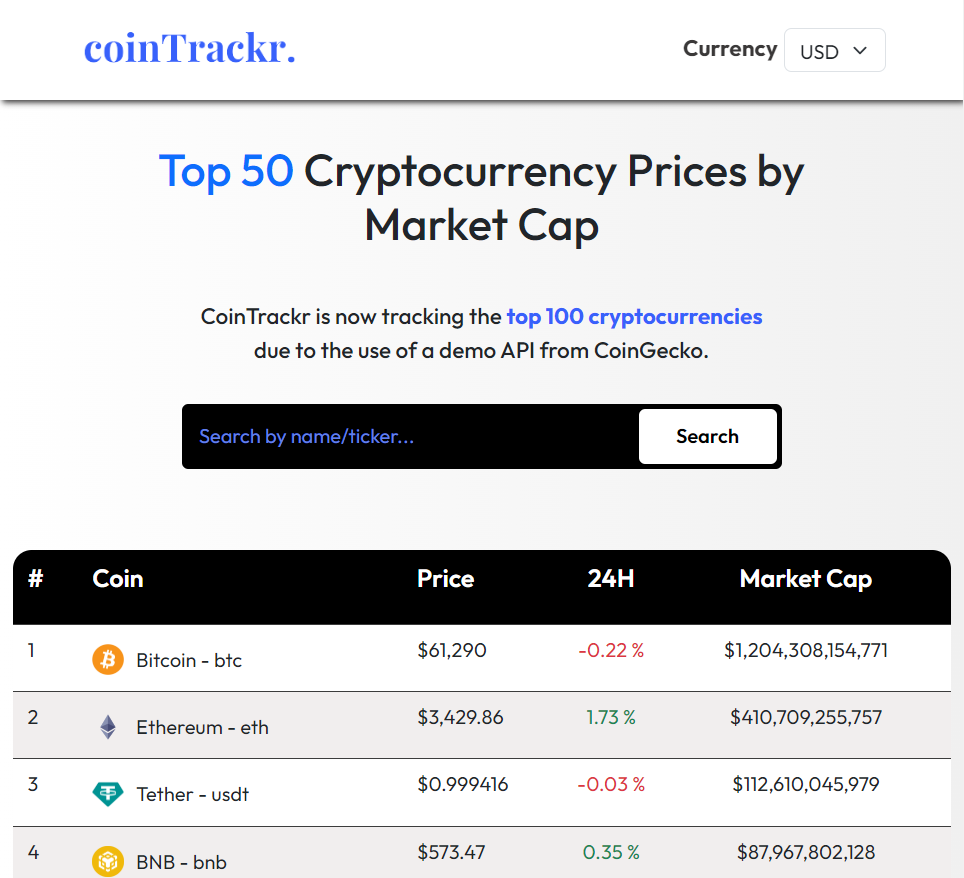 CoinTrackr is now tracking the top 100 cryptocurrencies with the use of demo API from CoinGecko.